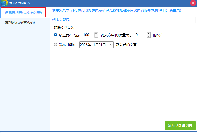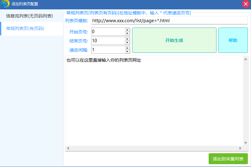 因为常规列表是有页码的,你要手动一个个修改是很麻烦的,可用这个功能去生成列表链接.这个截图下方才是你添加列表链接的地方,列表链接是一行一个,添加完以后点击"添加到采集列表",就可以了.